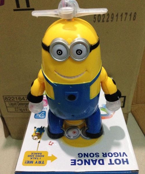– Đồ chơi thông minh Minion có thể phát nhạc nghe rất vui tai , giữa hai chân có một trụ xoay giúp đồ chơi vừa có thể nhảy múa vừa có thể xoay vòng 360 độ , ở trên đầu có gán một chong chóng khi xoay sẽ phát sáng xoáy vòng tạo hình tròn sáng xung quanh trông rất thích mắt