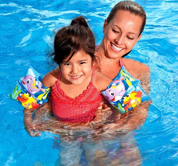 – Đeo phao vào hai cánh tay cho bé, bạn sẽ không còn phải lo sợ khi bé xuống nước mặc dù chưa biết bơi.