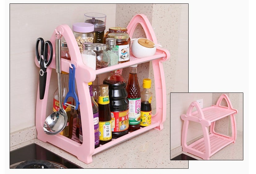 Kệ để đồ nhà bếp 2 tầng chữ A, tầng dưới để các chai lọ cao, tầng trên để lọ thấp
