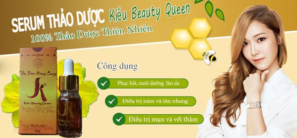 Serum thảo dược – Kiều Beauty Queen được chiết xuất từ thảo dược thiên nhiên quý hiếm không chứa chất bảo quản, không gây kích ứng cho da và có đa công dụng: làm lành nhanh chóng vết bỏng vết trầy xước mà ko để lại sẹo, trị rôm sẩy , hăm tả ở trẻ nhỏ, tái tạo phục hồi các loại da : da khô, da xỉn màu , dị ứng , da bị lão hóa xuống cấp do kem trộn , da tím tái do nhiễm chì, làm mờ các vết nám , tàn nhang, ngăn ngừa mụn và trị mụn, chữa viêm da dị ứng, kích thích mọc mi và đen mi, sản phẩm đặc trị vết thương do các loại côn trùng cắn đặc biệt là kiến ba khoang.